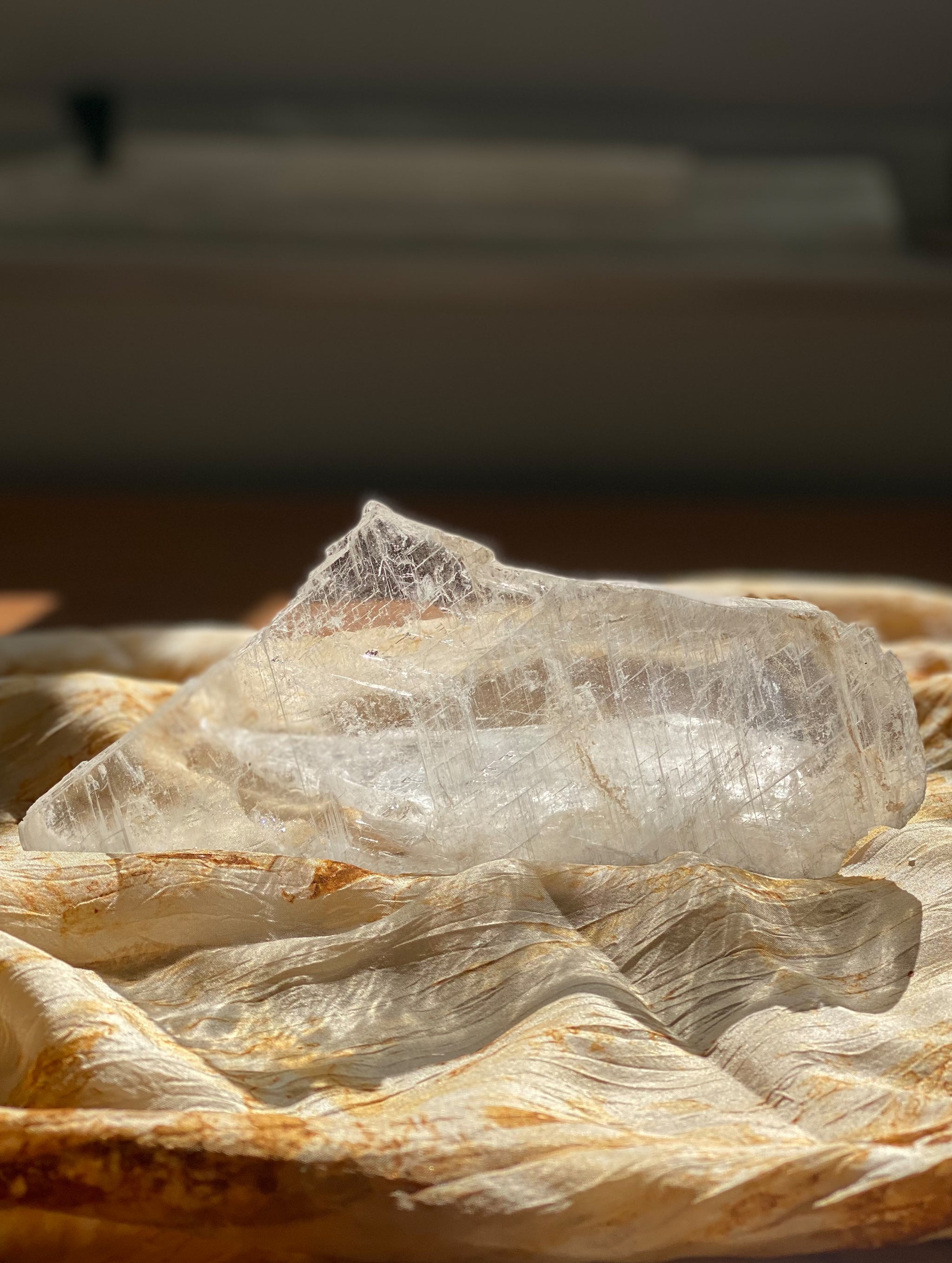 純淨透明的結晶石膏石,頻率振動精細而且十分之強大,能完全融合在環境之中;能非常有效地清潔我們的氣場,徹底清除阻塞的負面能量。每日用的手錶、手飾放在石膏石上也可以有效得到淨化。